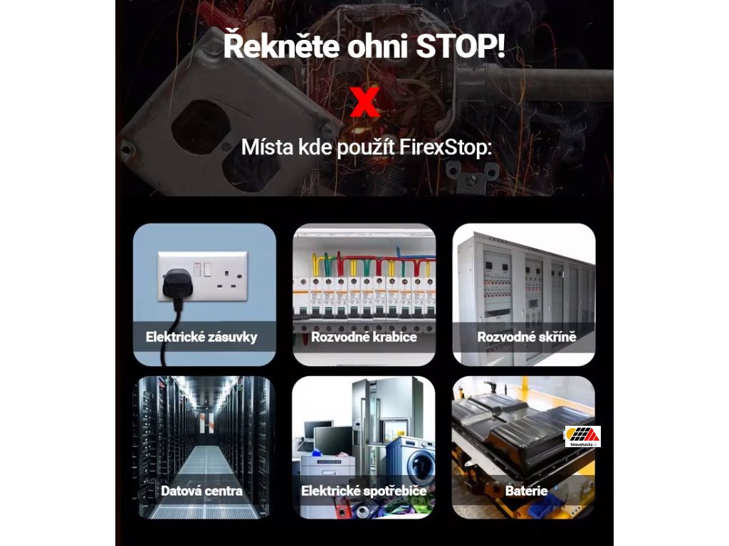 FIREXSTOP je inovativní prostředek pro rychlé hašení požárů v uzavřených prostorech. Využívá ochlazování, takže okamžitě hasí plameny bez poškození zařízení. Třída požáru: ABCE.