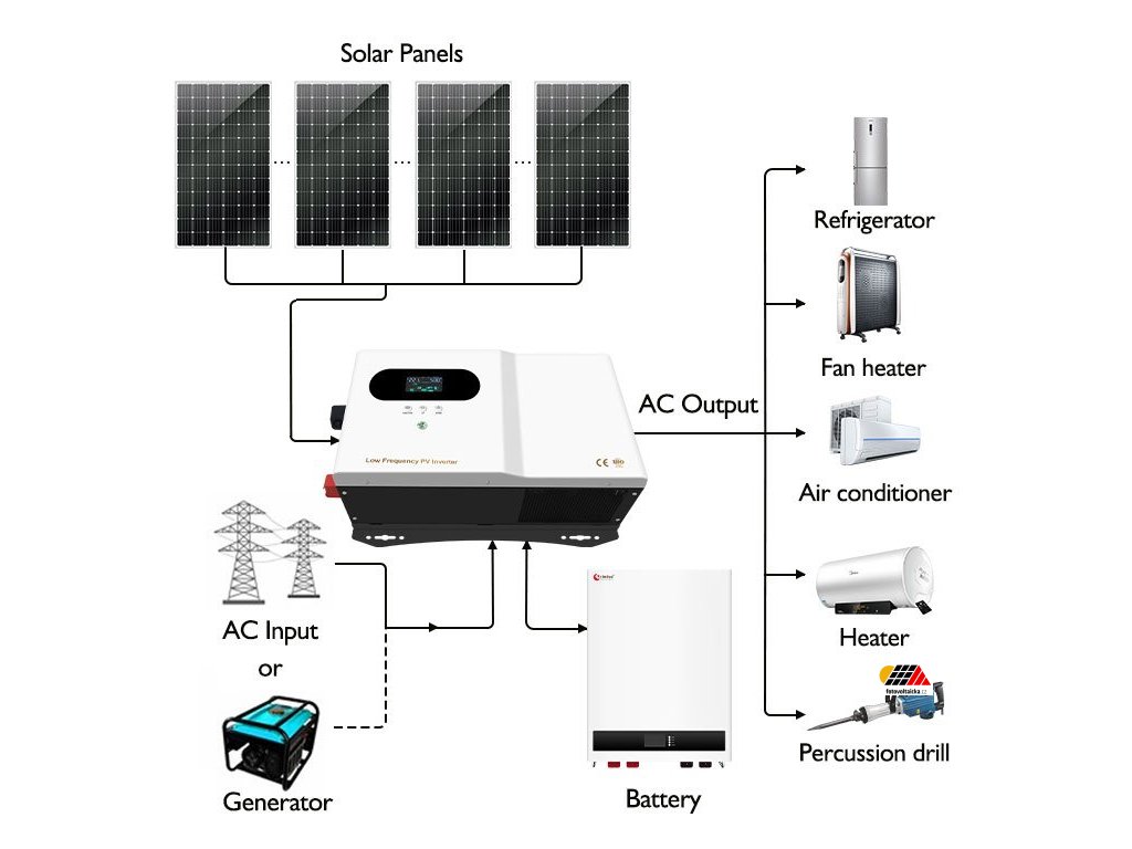 Systém nabízí tři provozní režimy (AC priorita, DC priorita, úsporný režim), podporu MPPT regulátoru a je vybaven funkcí adaptace na různé elektrické sítě (85 ~ 275 V AC, 45 ~ 65 Hz). Díky inteligentnímu LCD displeji a RS485 komunikačnímu portu s možností monitorování chybových kódů v reálném čase je ideální volbou pro stabilní a bezpečný provoz i v náročných podmínkách.