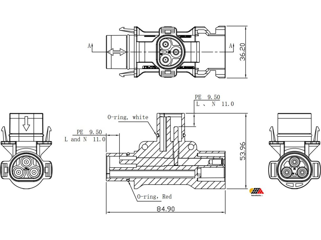 Kabelový slučovač určený pro mikroinvertory značky DEYE s konektory 1x samec + 2x samice pro možnost sloučení AC vývodů ze dvou mikroinvertorů do jednoho kabelu s maximální napětím 690 V AC a maximálním proudem 40 A. T-konektor je vyroben z plastu, má venkovní provedení a stupeň krytí IP67.