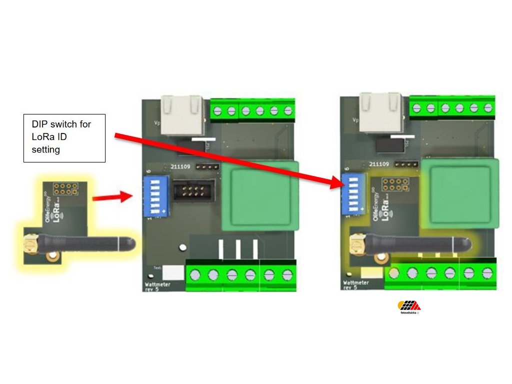 Pokud je váš Olife SmartMeter vybaven modulem pro bezdrátovou komunikaci, nastavte kanál, na němž LoRa vysílá a přijímá signál. TID v měřiči SmartMeter se nastavuje pomocí přepínačů DIP a instaluje se na základní desku podle obrázku. Rozsah je 0-15. Stejné ID musí být nastaveno i v dobíjecí Wallbox stanici.