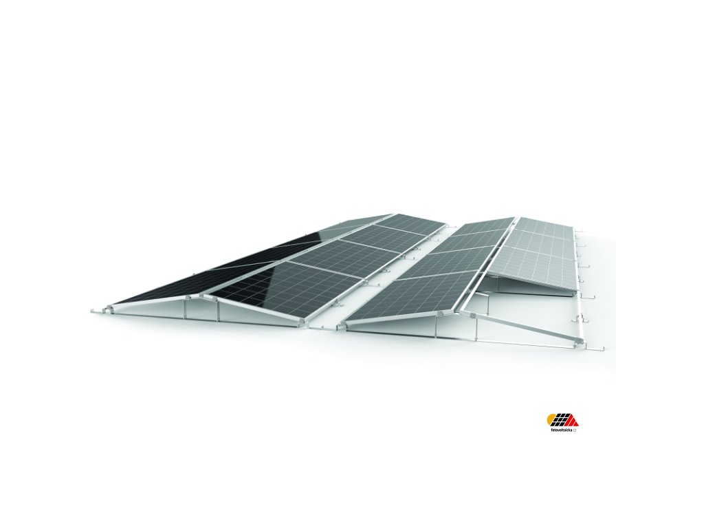 Lehká hliníková trojúhelníková konstrukce ve sklonu 10° je navržena pro montáž fotovoltaických panelů s orientací VÝCHOD/ZÁPAD o rozměrech až 1134 × 2300 mm. Díky modulárnímu systému ze 6 částí nabízí snadnou