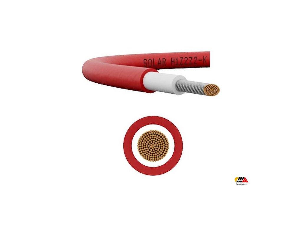 Solární jednožilový kabel s dvojitou izolací, červené barvy pro kladný pól a průřezem 6 mm2 určený pro venkovní použití na DC straně fotovoltaických systémů a to na propojení měničů a solárních panelů. Kabel je odmotáván na míru podle přání zákazníka, z cívky o délce 500 m.